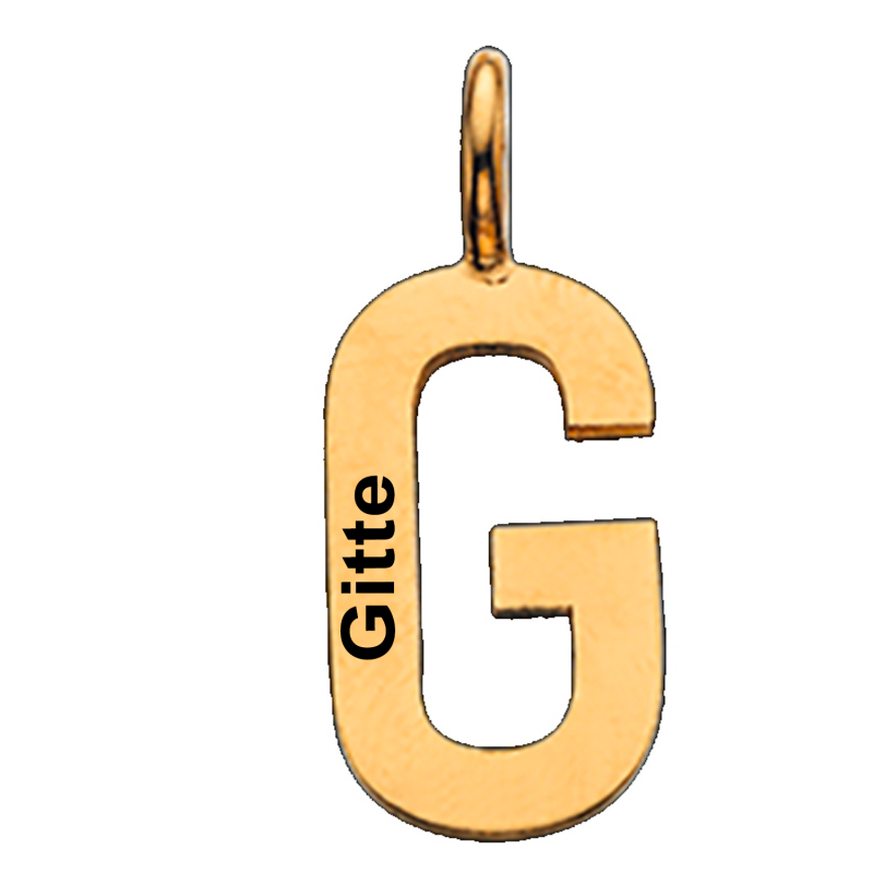 Et enkelt og flot bogstavs vedhæng i forgyldt sølv. G bogstavet kan lasergraveres med din egen tekst, på siden af G’et. Skriften vil fremstå i let sort farve og vi anbefaler ca. 10 tegn på dette vedhæng. Her bliver Ariel mest læseligt. G vedhænget måler ca. 15 mm i højden og leveres med 42 cm forgyldt kæde. Flot smykke vedhæng til en du holder af. Leveres i æske, så det er lige klar til at give som gave.