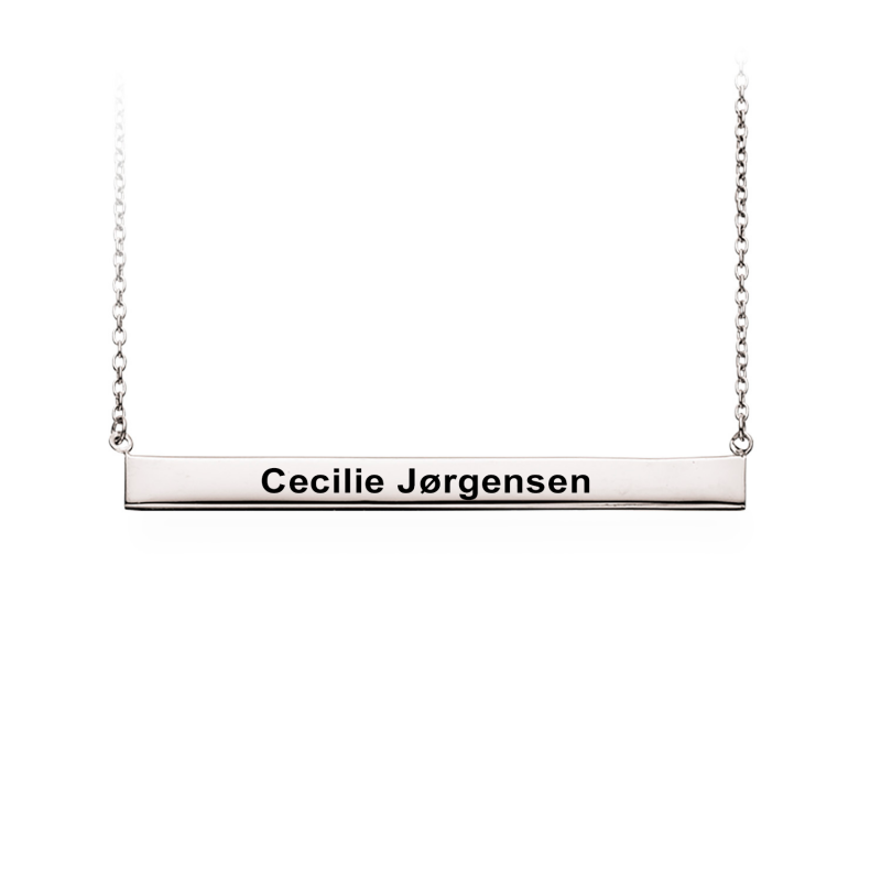 Vedhænget måler ca 46 x 5 mm og leveres med 40 kæde som gør at kæden sidder højt på halsen. Vi anbefaler Us block til dette sølv smykke. Teksten vil blive ridset ned i metallet og fremstå i sølv farve. Her kan der ca være 10 tegn på 1 linje. Smykke er vældig populær og smart samme med andre smykker. Giv det til studenten, konfirmanden