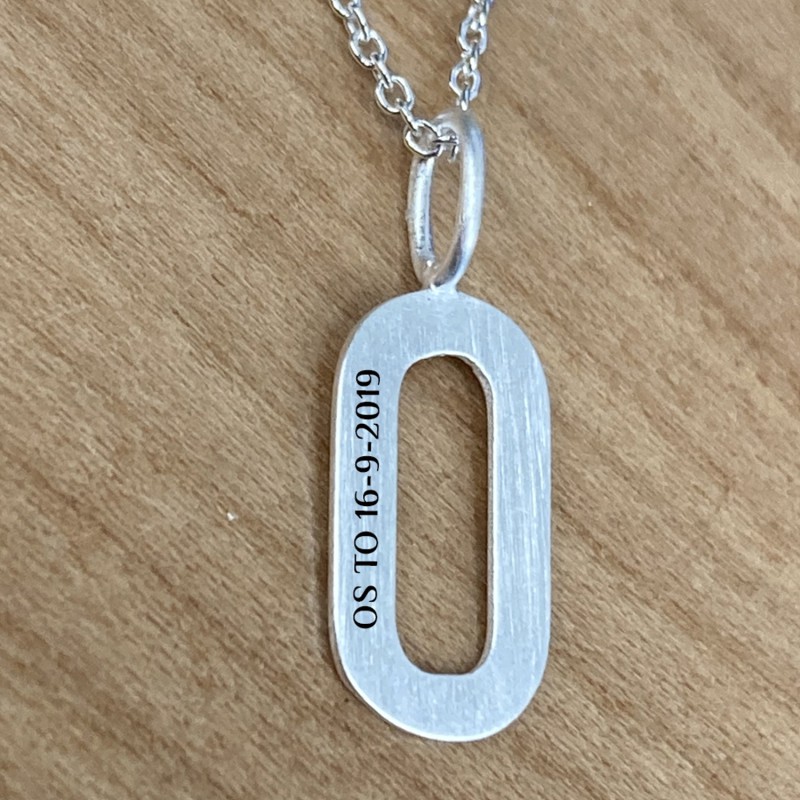 O bogstave i sølv er en enkelt og flot sølv bogstave vedhæng. Vedhænget kan lasergraves med egen tekst på siden og her kan der ca være 10 tegn. Teksten vil blive lasergraverede og fremstå i let sort farve. Her kan alle vores skrifttyper anvendes, dog anbefaler vi Ariel som bliver mest læseligt.O- vedhænget leveres med kæde i 42 cm og måler 15 mm. Et flot smykke som leveres i smykkeæske så det er klar til at give som gave.