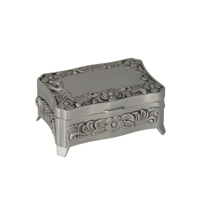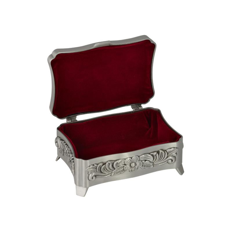 Smykkeskrin med indgravering. Elegant smykkeskrin til dine fine smykker. Smykkeskrinet er i tin har en flot sølv blank overflade. Det måler 75 x 110 mm cm kan indgraveres med din personlige tekst. Teksten vil blive lasergraverede og fremstå i sort farve. Her kan alle vores skrifttyper anvendes og ca 40 tegn. Et fint lille smykkeskrin som kan give måske med et lille smykke i.