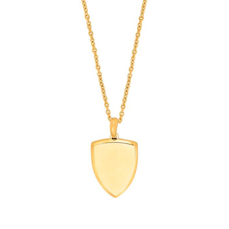 tlf. 20 33 76 60Dette herresmykke i forgyldt stål har en flot skjoldform, der måler 23 x 28 mm, og leveres med en 60 cm kæde, hvilket giver et maskulint og moderne look. Smykket kan lasergraveres med op til 30 tegn, og teksten vil fremstå i sort, hvilket skaber en smuk kontrast til den forgyldte overflade.