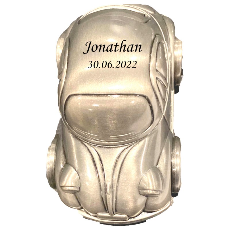 Sjov lille sparebøsse til de mindste.Hvem kan ikke huske da "bobbel bilen" kom frem, den var da sjov. Her har man designet den i en flot mini udgave. Folkevogn sparebøssen lasergraves med din personlige tekst på taget og den vil fremstå i let sort farve. Her anbefaler vi Ariel som skrifttype og max 30 tegn. Bobbel / Folkevogn sparebøssen måler 120 x 70 mm og er forkromet, som gør den ikke skal pudses. Leveres i fin æske, så den er klar til at give som gave.