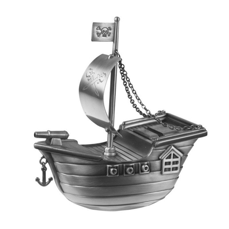 Sørøverskib sparebøsse er med flot sejl som sidder løs i skibet - samlede med kæde. På en lille plade kan du få indgraverede din personlig gravering som for de meste er navn på drengen og dåbsdato. Teksten vil blive lasergraverede og fremstå i let sort farve. Her anbefaler vi ca 30 tegn og alle vores skrifttyper kan anvendes. Sørøverskibet måler ca 140 x 150 mm med flag og med det fortinnet overflade skal denne sparebøsse ikke pudses. Leveres i æske så den er klar til at give som gave.
