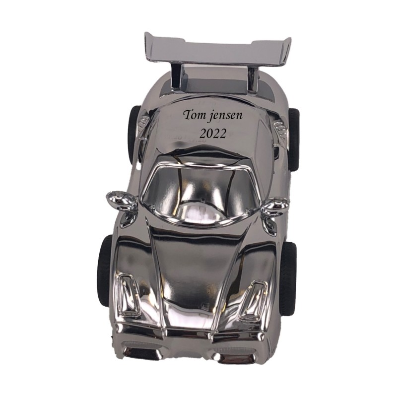 Racerbilen i sølv look kan lasergraves på taget med din personlige tekst. Teksten vil fremstå i let sort farve og her kan alle vores skrifttyper anvendes. Vi anbefaler ca. 40 tegn fordelt på 2 linjer og her vil det for det meste være et fornavn samt en dåbsdato. Racerbilen måler 130 x 60 mm og har gummihjul, som gør at barnet kan lege med den. Leveres i æske, så den er klar til at give som gave.