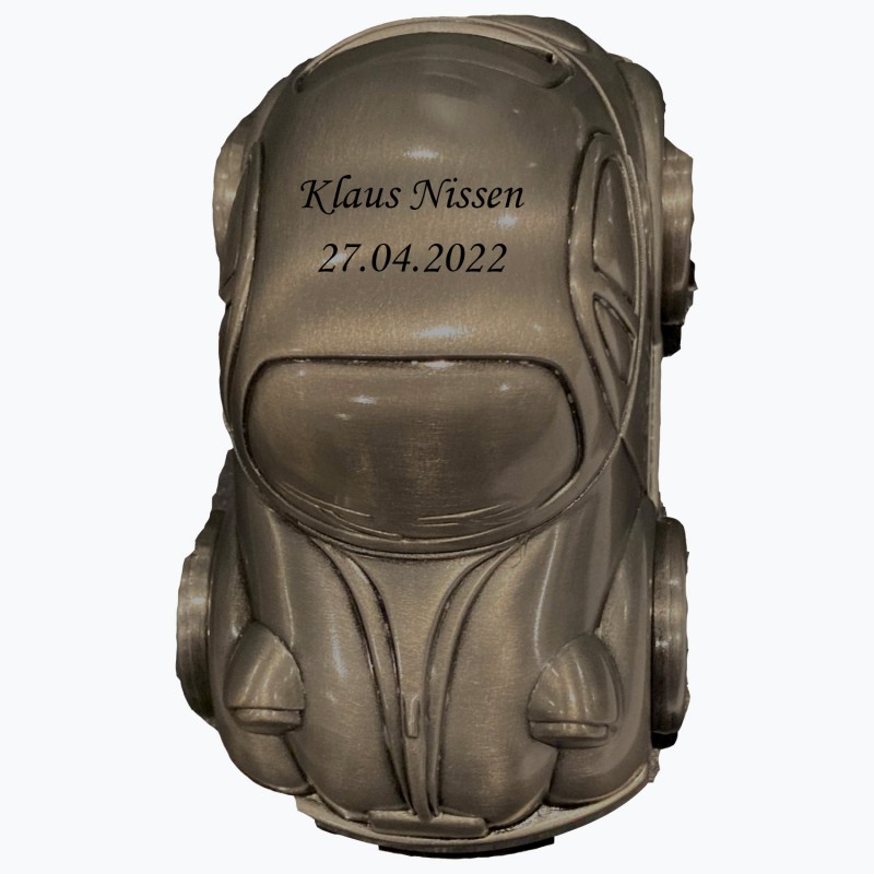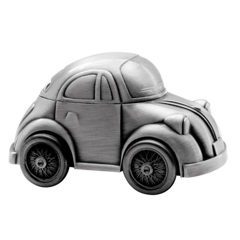 Folkevogn sparebøssen lasergraveres på tag og her kan alle vores skrifttyper anvendes. Teksten vil fremstå i let sort farve og der kan ca være 30 tegn fordelt på 2 linjer. Hvis den er til dåbsgave er det typisk fornavn og dåbsdato der kommer på. Bobbel / Folkevogn måler 120 x 70 mm og hjul som kan dreje. Den leveres i fin æske så den er klar til at give som gave. Det fortinnet look gør at den ikke anløber og skal derfor ikke pudses.