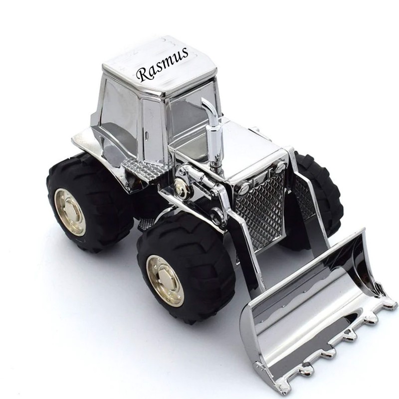 Med de kraftige gummihjul på sparebøsse og frontlæsseren der kan løftes op og ned, kan drengen lege at det er en rigtig gravko. Sparebøssen kan lasergraveres på tag med din personlige tekst. Graveringen vil fremstå i let sort farve og her anbefaler vi alle vores skrifttyper. Gravko måler 140 x 85 mm og der kan ca være 30 tegn. Den leveres i fin æske så den er klar til at give som gave.