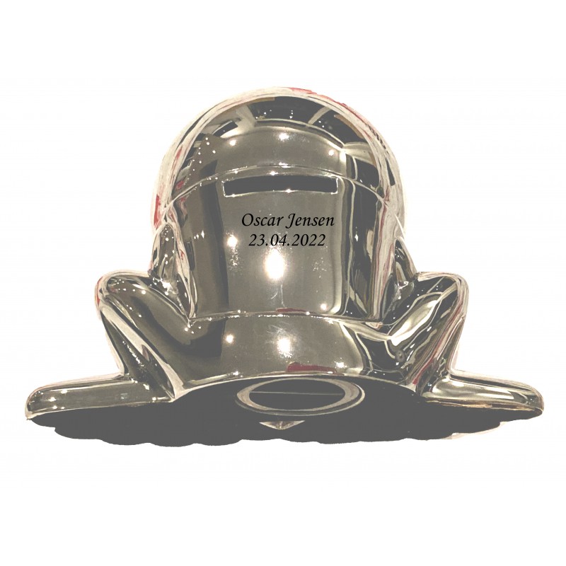 Den kendte figur kaj i forkromet ( sølv look ) kan lasergraveres bagpå ved møntindkast. Teksten vil fremstå i let sort farve. Her kan der ca være 30 tegn fordelt på 2 linjer. Vi anbefaler Ariel eller Cosivia som skrifttype. Sparebøssen mål ca 140 x 90 mm og leveres i fin æske, så den er klar til at give som gave.