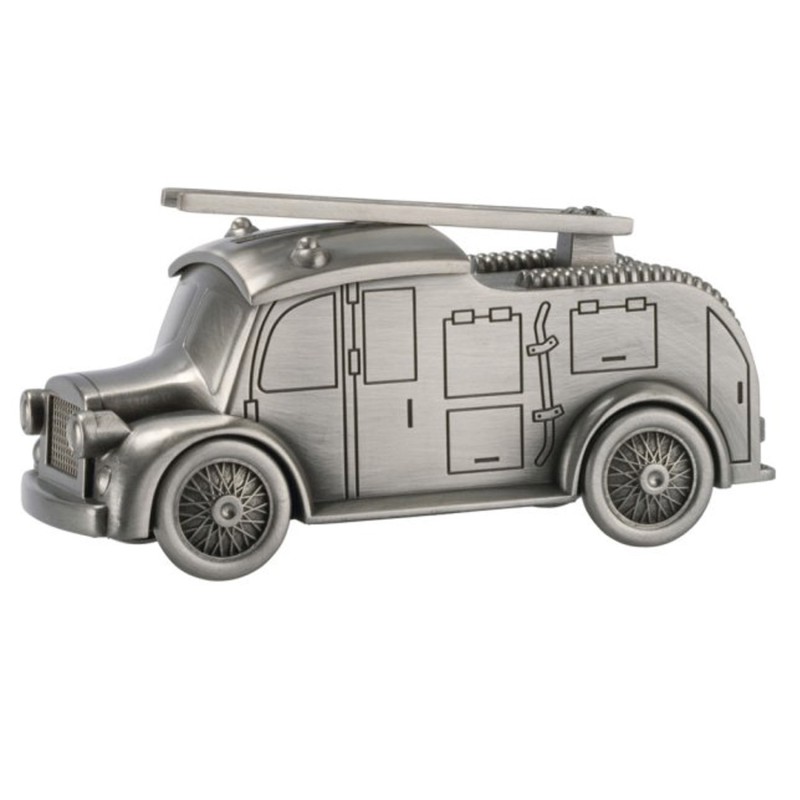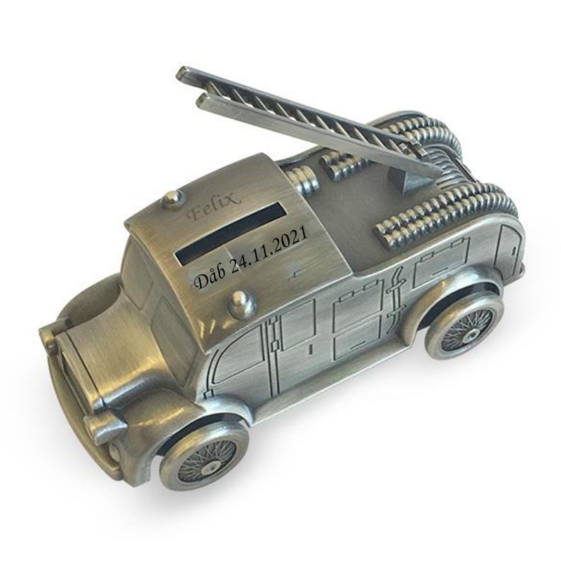 Sparebøsse brandbil er i fortinnet look og har en stige på taget der kan hejses. Den har drejbar hjul, så den lille dreng kan lege med den. På taget på hver side af stigen kan den lasergraveres med din personlige tekst. Teksten vil fremstå i let sort farve og her anbefaler vi ca. 15 tegn pr linje. Alle vores skrifttyper kan anvendes. Sparebøssen måler 60 x 140 mm og leveres i æske, så den er lige til at give som gave.
