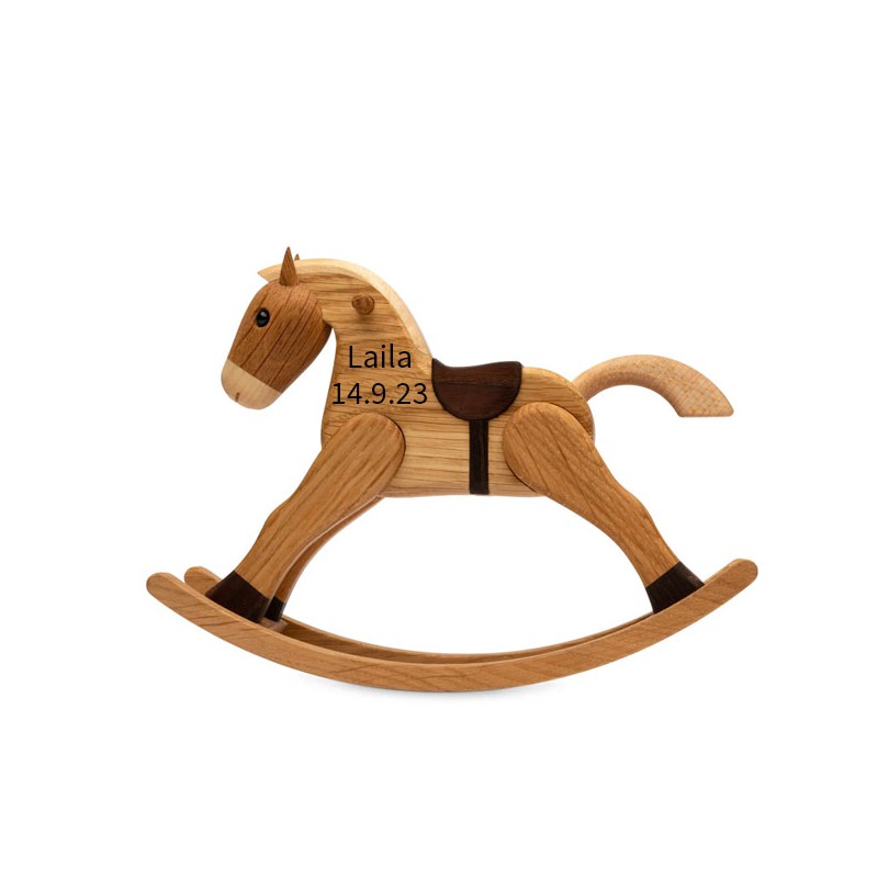 tlf. 20 33 76 60Gyngehesten er en bedårende figur af Chresten Sommer, der leder tankerne hen på barndommen. En minimalistisk dekoration med bløde former, som giver figuren et organisk og stilrent udtryk. Figuren er fyldt med smukke detaljer, der inviterer til nærmere undersøgelse. Læg mærke til figurens lyse manke, dens spidse ører og den flotte saddel, som Gyngehesten bærer på ryggen. Her kan du få graverede en lille tekst på hals og der kan max være 20 tegn fordelt på 2 linjer. Teksten vil blive brændt ned i træet og fremstå i let sort farve. Her anbefaler vi Ariel som skrifttype da det bliver mest læseligt. Gyngehesten, som på engelsk hedder The Rocking Horse, vil pryde ethvert rum med sin elegance og samtidig skabe et personligt touch i din indretning. Skab ro og varme med den kære dekoration, som vil sætte et harmonisk præg på dit hjem. Figuren er lavet i træ, hvilket skaber en rolig atmosfære i ethvert rum. H 13,5 cm - FSC-certificeret egetræ.