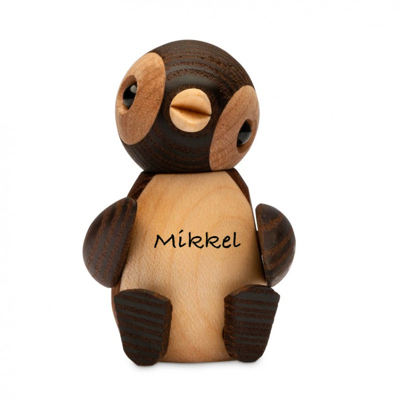 Pingvinen er 7 x 4 cm og kan indgraveres foran på maven med ca 30 tegn. Teksten vil blive brændt ned i træet og fremstå i let sort farve. Vi anbefaler Ariel eller Bradley som skrifttype. Graveringen vil være foran på maven. Pingvinen kommer i fin æske og kan gives i gave til mange begivenheder. En flot ting til hjemmet som vil holde i mange år.