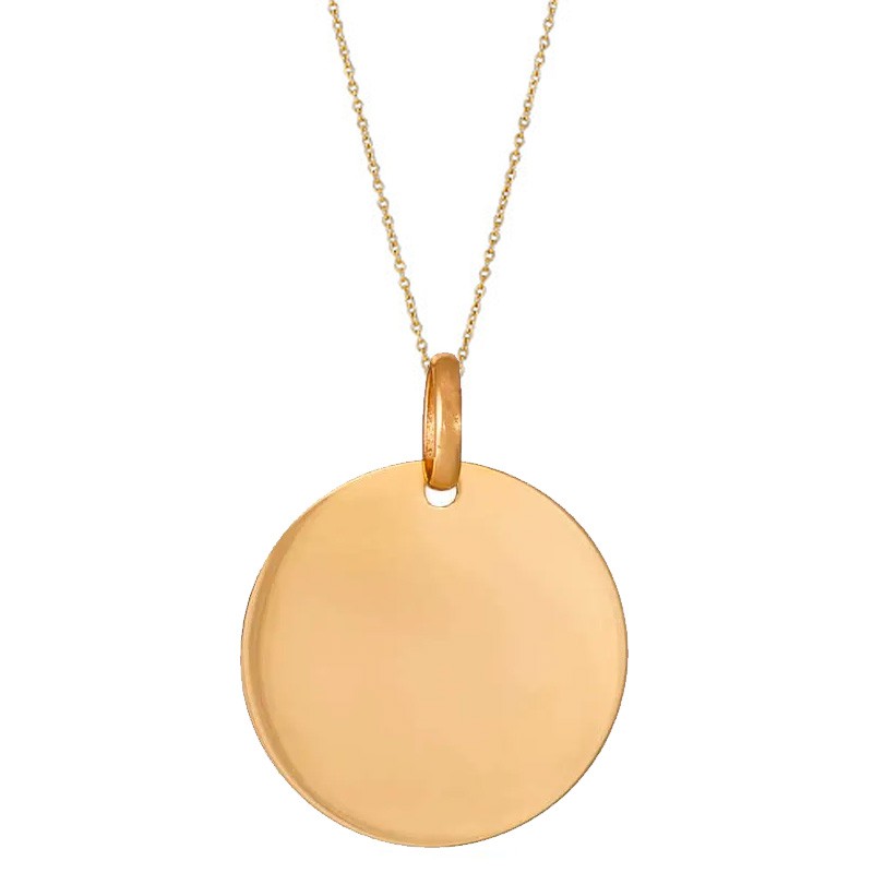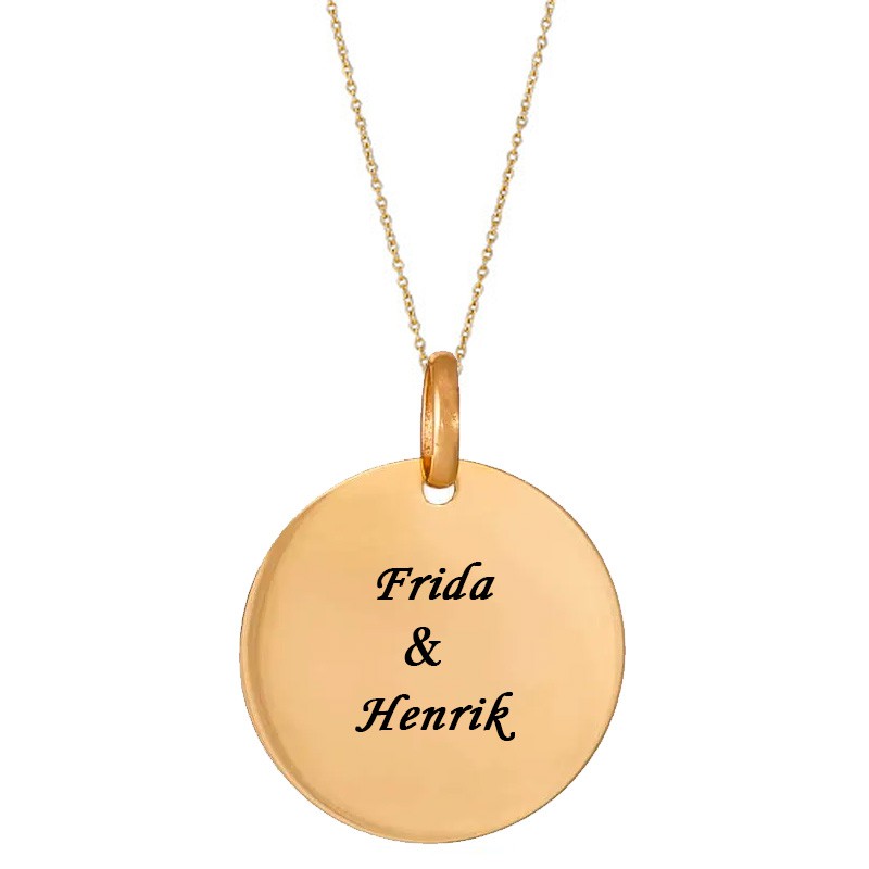 Med mulighed for indgravering på forsiden (op til ca. 30 tegn), kan smykket personliggøres med en speciel besked, dato, eller navn, og det kan leveres med enhver ønsket skrifttype. Teksten vil blive lasergraverede og fremstå i let sort farve. Vedhænget, som måler ca. 17 mm, kommer med en 42 cm kæde og præsenteres i en gaveæske – perfekt til en mindeværdig gave.