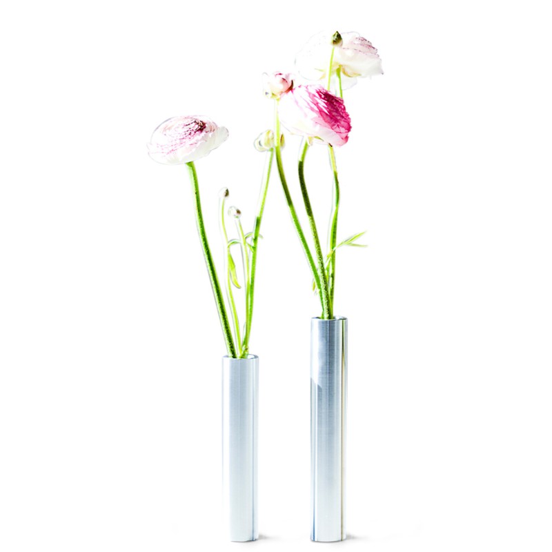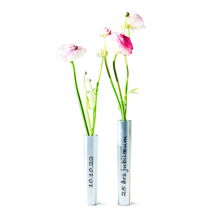 Slim vaserne er en god kontrast til blomsterne og giver et taktil udtryk. Sammen med Slim Light lysestagen skaber de et minimalistisk, slankt og elegant look. Slimvasen er lavet i massiv stål og vælter ikke. I enden er der lavet en lille glas indsats som beholder til vandet og blomsterne. Vasen kan lasergraveres med en kort lille tekst og ca 5 linjer. Her kan der max være 10 tegn pr linje. Teksten vil blive lasergraveret og fremstå i sort farve. Vi anbefaler Ariel som skrifttype. Inspirationen er den nordiske stil, der kommer til udtryk gennem de rene linjer og det udvalgte materiale. Slim-produkternes minimalistiske design og materiale er nemme at style med ethvert af dit nuværende interiør Leveres i paprør.
