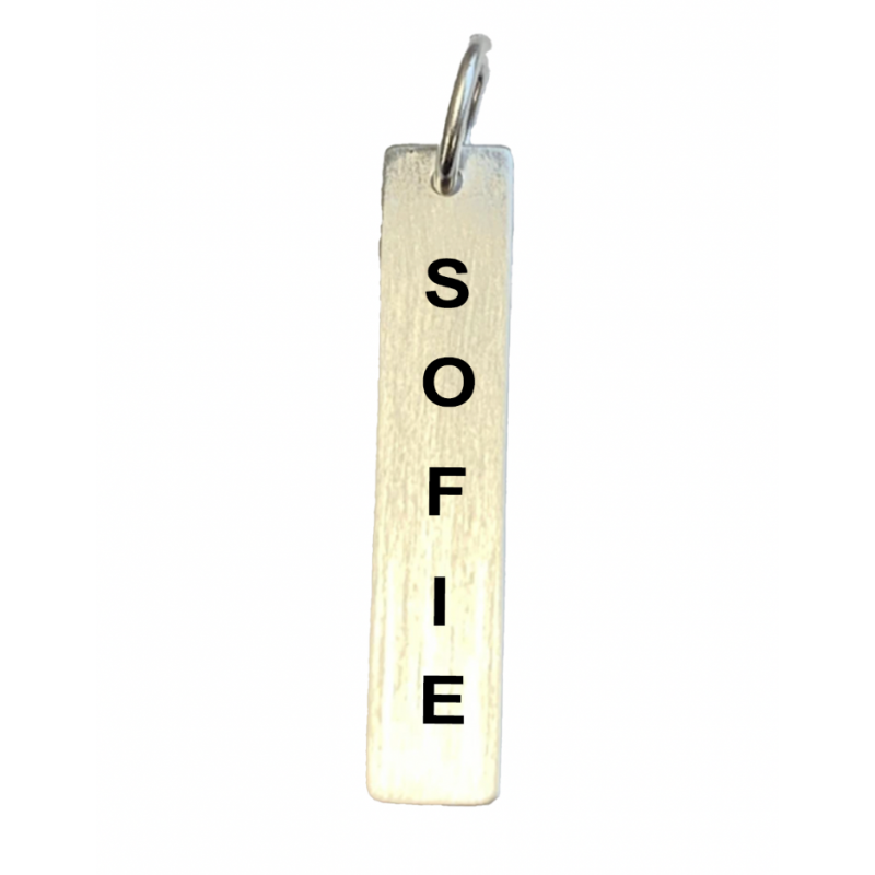 Vedhænget måler 30 x 6 mm og er i massiv sølv. Vedhænget kan indgraveres på den ene side med personlig tekst. Vi anbefaler Ariel som skrifttype og der kan max være 12 tegn på hver side. Teksten vil stå lodret. Navnevedhænget leveres med 42 cm kæde.