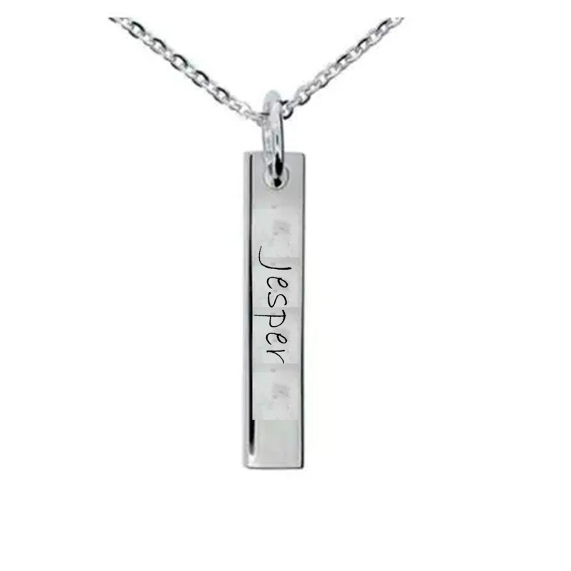 Meget flot og stilfuldt smykke med facet slibninger på forsiden og mat bagside hvor der kan indgraveres. Vedhænget måler 5 x 20 mm og leveres med 42-45 cm kæde. Her kan en sød lille hilsen graveres eller et navn og dato. Smykke er perfekt til manden. Vi anbefaler Ariel som skrifttype og graveringen vil blive på den lange led, så man skal