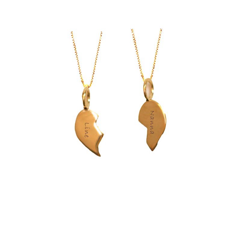 Nordahl Andersen knækhjerte i 8 kt guld. Forsiden har naturligt mønster i overfladen. Bagsiden er flad og blank. Knækhjertet leveres med 2 kæde og kan indgraveres på bagsiden med hver jeres navn eller hvad i nu ønsker. Vi anbefaler ariel, corsiva eller bradley som skrifttype og max 10 tegn pr. del. Graveringslinje 1 er den ene halvdel af hjertet. Graveringslinje 2 er anden halvdel af hjertet. Hjertet måler ca ca 14 mm i højden. Leveres med 40 + 2 cm lang kæde i forgyldt sølv og i fin æske, så det er lige til at give som gave. Giv det til verdens bedste ven / Veninde eller den bedste kæreste.