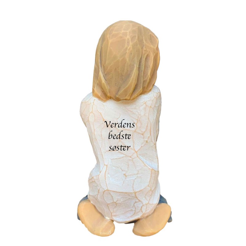 Figuren kan lasergraveres bagpå trøjen - teksten vil fremstå i let brun farve og vi anbefaler Ariel som skrifttype. Her kan der ca være 20 tegn fordelt på 3 linjer. WILLOW TREE figur leveres i æske, så den er lige klar til at give som gave.