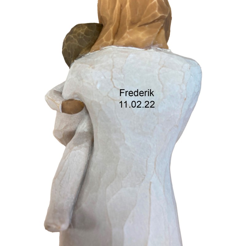 Denne fine figur er 22 cm i høj og er lavet i polystone - hvor den derefter er håndmalet. Designet af en kendt kunstner der hedder Susan Lordi. Willow Tree Child of My Heart. "Child of the world, Into my heart you came - Bringing sun into my life, Making family our name."Figuren kan lasergraveres bagpå - teksten vil fremstå i let sort farve og vi anbefaler Ariel som skrifttype. Her kan der ca være 20 tegn fordelt på 2 linjer. WILLOW TREE figur leveres i æske, så den er lige klar til at give som gave.
