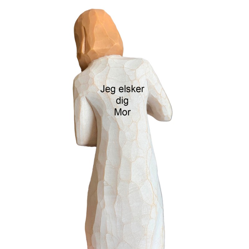 Figuren kan lasergraveres bagpå - teksten vil fremstå i let brun farve og vi anbefaler Ariel som skrifttype. Her kan der ca være 30 tegn på hver ryg. WILLOW TREE figur leveres i æske, så den er lige klar til at give som gave.