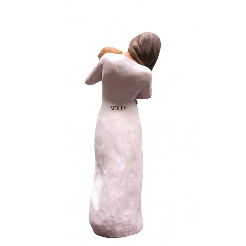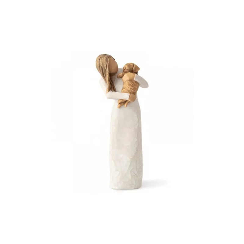 En smuk og betænksom gaveidé! Willow Tree-figuren med en gylden hund i armene er perfekt til dyreelskere, og med muligheden for lasergravering bagpå tilføjer det et personligt præg. Figuren, som er 19,5 cm høj, kombinerer kunstneren Susan Lordis unikke design med håndmalede detaljer i polystone, hvilket giver den et særligt udtryk. Graveringen anbefales i Arial skrifttype og vil fremstå i en let sort farve. Der er plads til ca. 20 tegn fordelt på 2 linjer, hvilket giver mulighed for en kort, men betydningsfuld besked. Figuren leveres i en æske, hvilket gør den klar til at give som gave, direkte fra pakken.