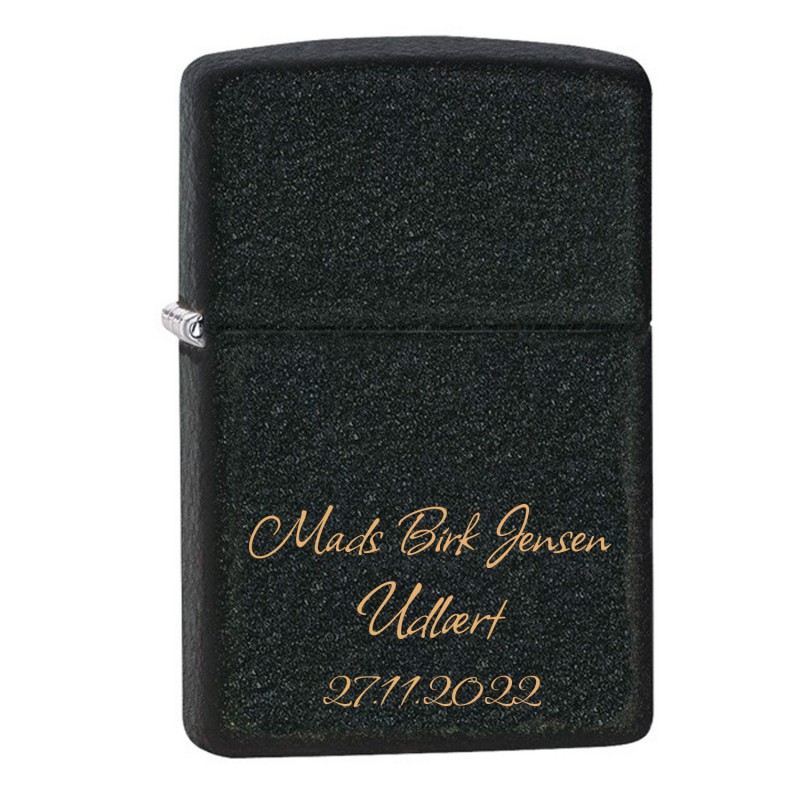 Sort Zippo lighter med rå look. Lighteren måler 35 x 55 mm og har med det sort look en meget flot og rå overflade. Zippo lighter kan kun laser graveres og teksten vil fremstå i forgyldt farve. Her anbefaler vi ca 40 tegn pr side og alle vores skrifttyper kan anvendes. Zippo lighteren kan graveres på begge side og kommer i original æske. På alle Zippo lighter ydes der livsvarig garanti ved rigtig brug.